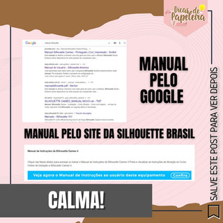 2️⃣ Na caixa, virá o manual de instruções e instalação, então leia com atenção antes de fazer qualquer coisa na sua máquina, não ligue na tomada sem antes ler. Se você já quiser ler antes de ela chegar pra já ir conhecendo, você pode baixar diretamente pelo Google digitando "Manual silhouette (nome da sua plotter)". Ou baixar no site da Silhouette Brasil Loja, conforme as imagens acima. Siga a risca o manual! Ok?!